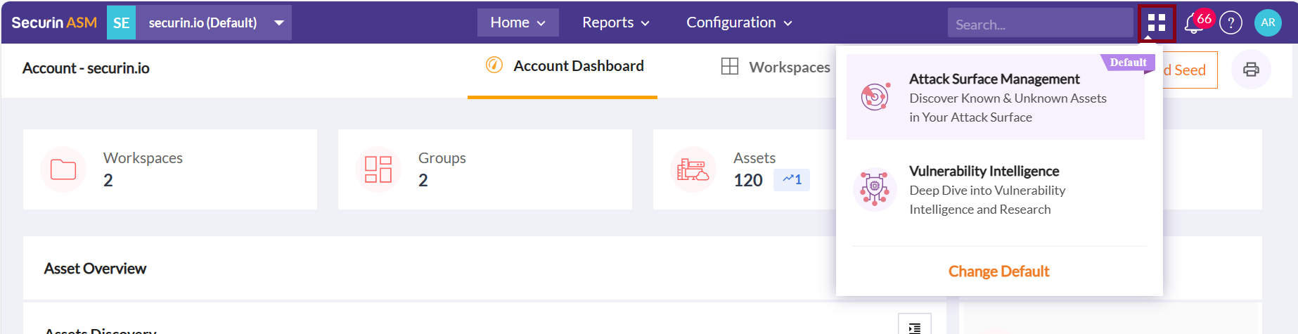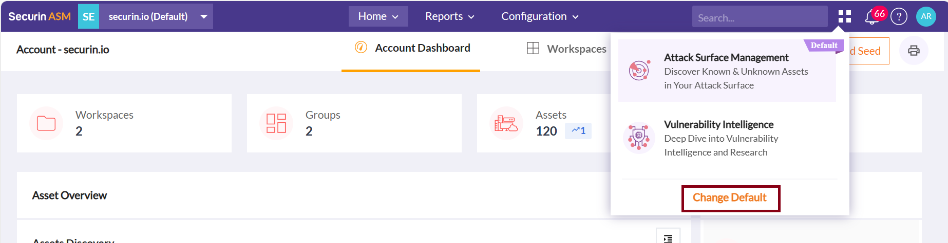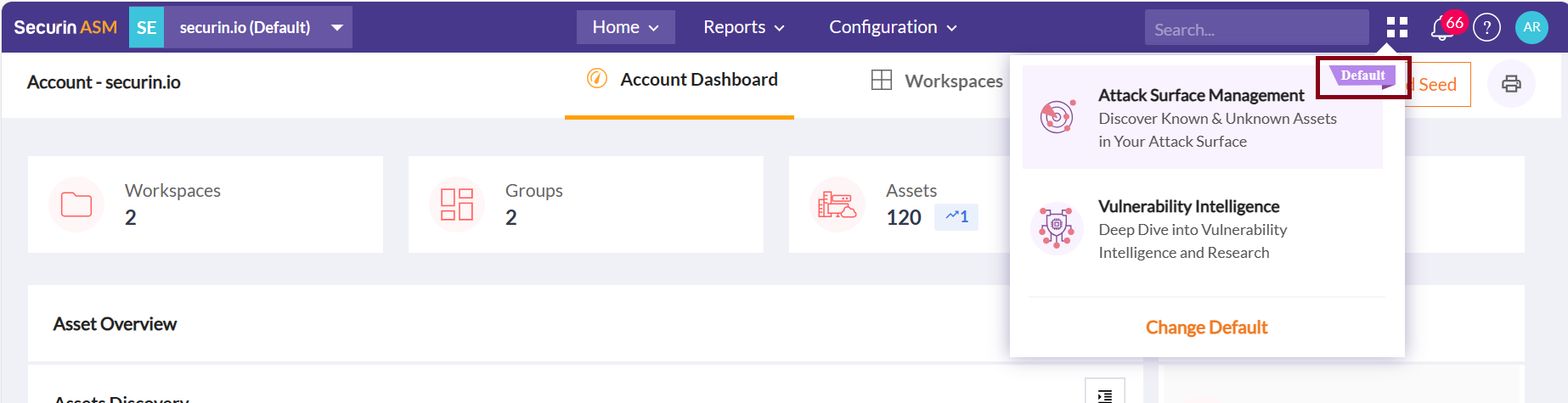 Overview: How to reconfigure your default landing page while logged in to Securin. You can switch the default landing page when you log in to Securin in two locations: the Product Select screen and the App Switcher. Reconfigure the Default Landing ...