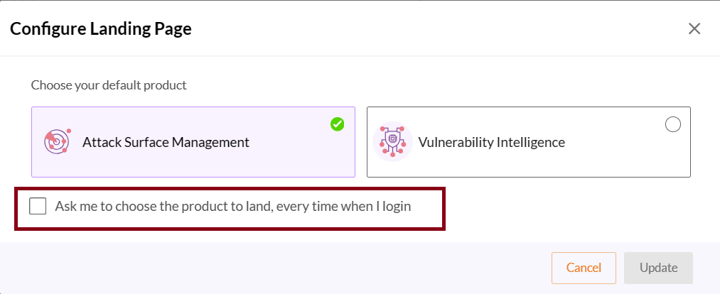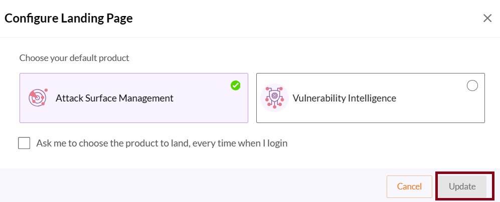 Click the Ask me to choose the product to land everytime when I login checkbox in the Configure Landing Page pop-up window.