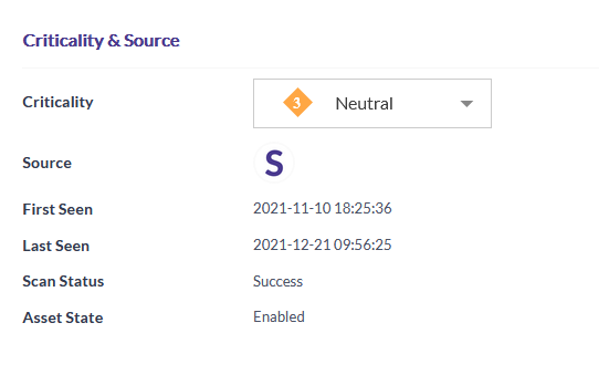 The Criticality and Source of the asset can also be seen in the detailed view summary. This screen details the asset criticality, the source or scanner that identified the asset, when the asset was discovered as active, asset scan status, and tags assigned to the network. You also have the option to modify the criticality of the asset here, to boost or bring it down the priority list, based on organizational context.